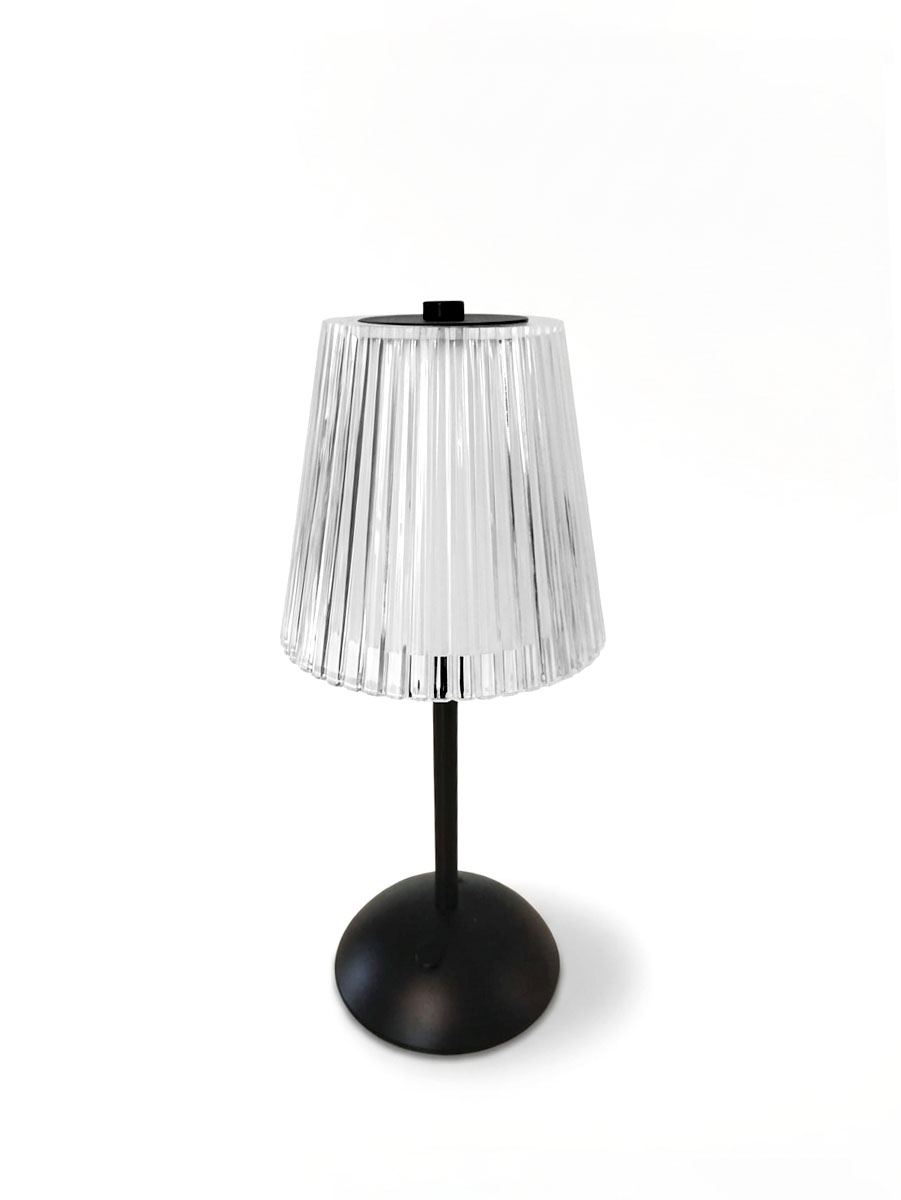 Lampka transparentna karbowana z białym kloszem w środku na czarnej nóżce to stylowy dodatek, który łączy dekoracyjny charakter z funkcjonalnym oświetleniem. Jej karbowana, przejrzysta obudowa tworzy efekt delikatnej gry światła, nadając przestrzeni wyjątkowej głębi i elegancji. Umieszczony wewnątrz biały klosz zapewnia równomierne, przyjemne światło, dostępne w trzech wariantach barwy — ciepłym, neutralnym lub zimnym — dzięki czemu lampka z łatwością dopasowuje się do atmosfery wydarzenia.