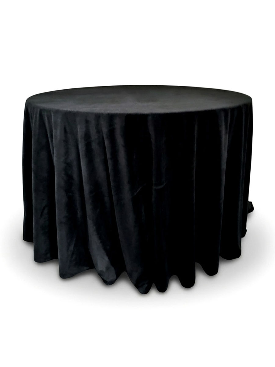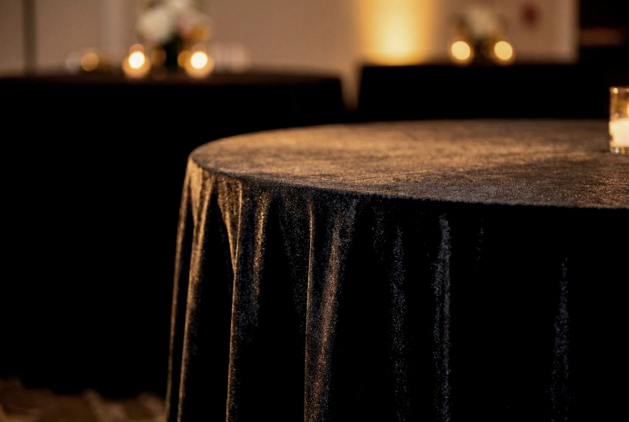 Obrus Velvet w czerni to wybór ponadczasowy, elegancki i niezwykle efektowny. Aksamit w tym kolorze pięknie podkreśla kontrasty, co sprawia, że cała aranżacja zyskuje wyrazistość. Idealny do wystawnych uroczystości, sesji zdjęciowych i przyjęć firmowych.