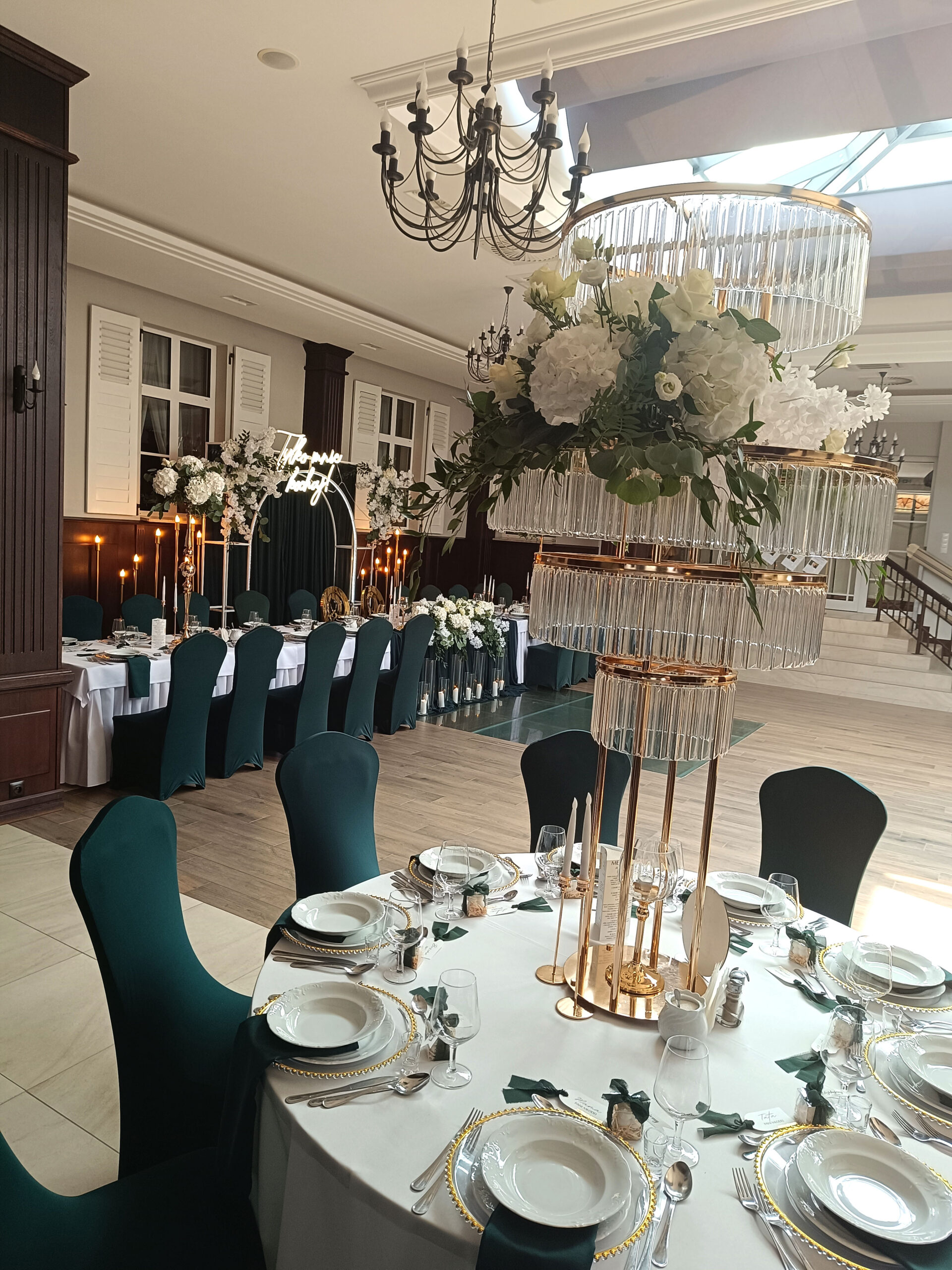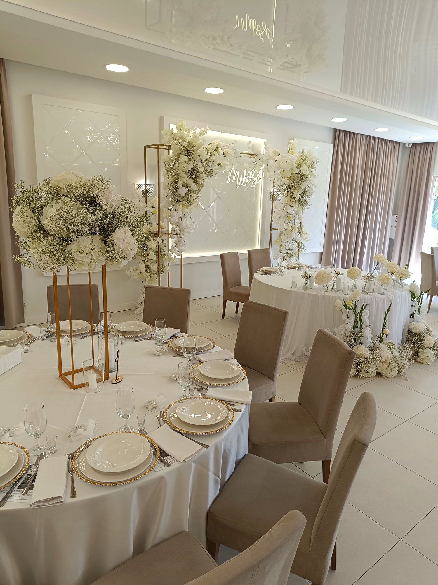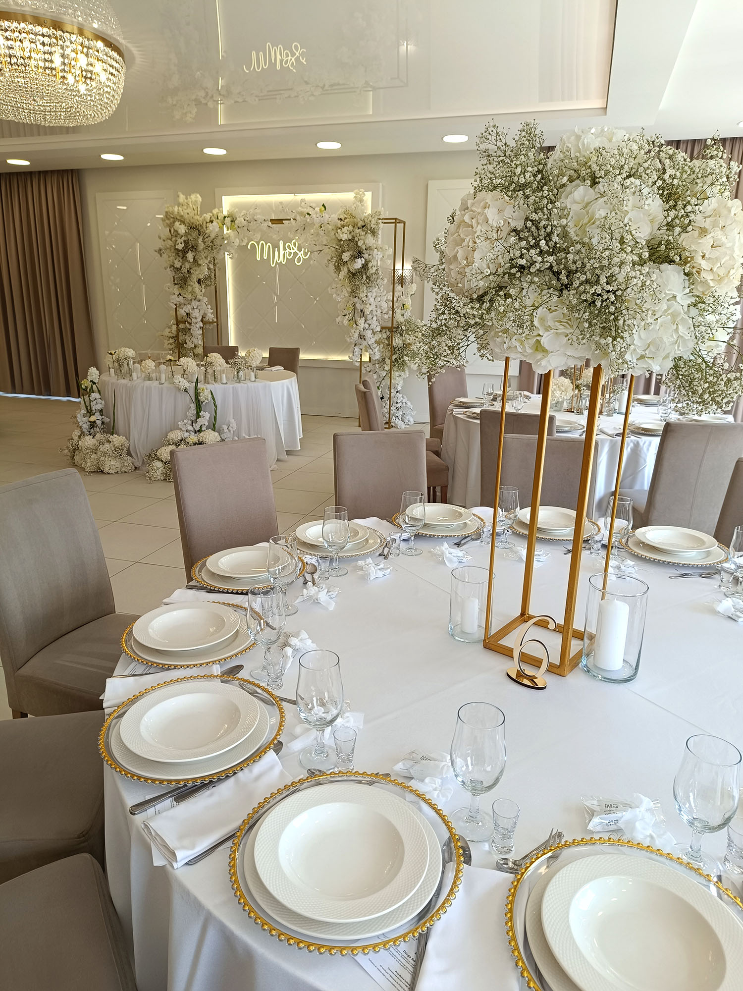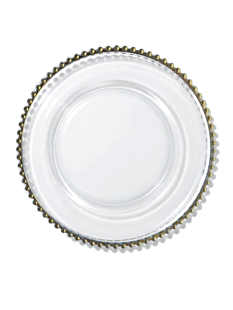Transparentny podtalerz z delikatnymi złotymi kuleczkami to subtelna, ale bardzo elegancka propozycja. Idealny na wesele, komunię, chrzciny i dekoracje o lekkim, eleganckim charakterze.