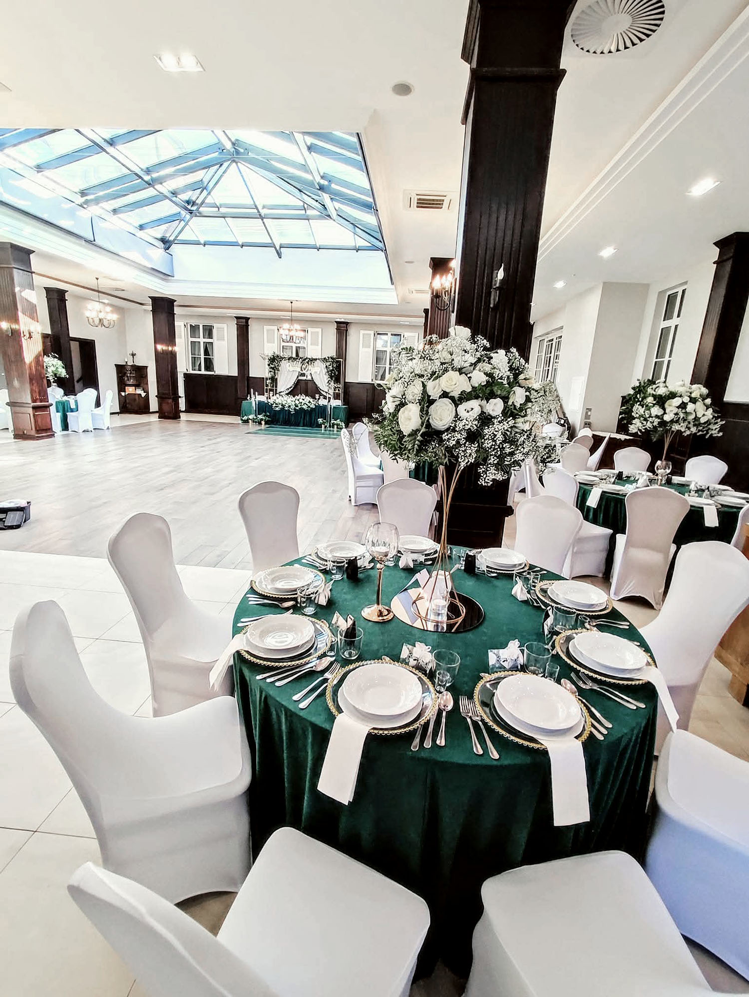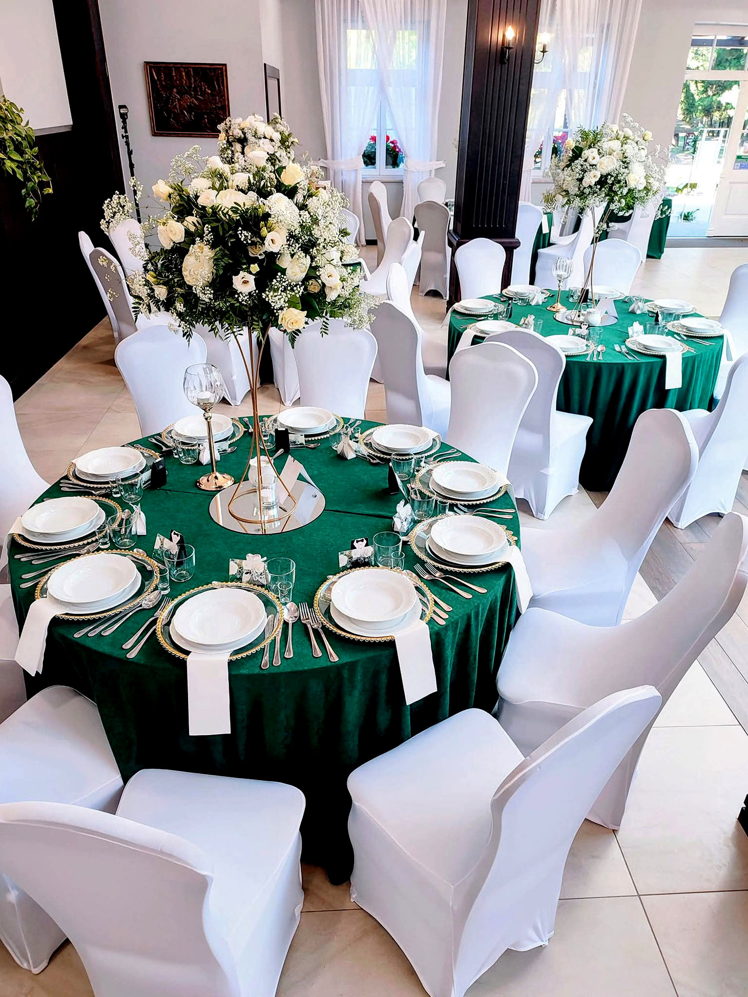 Biały pokrowiec to podstawowy element eleganckiej aranżacji. Nadaje sali lekkości i ponadczasowego charakteru.