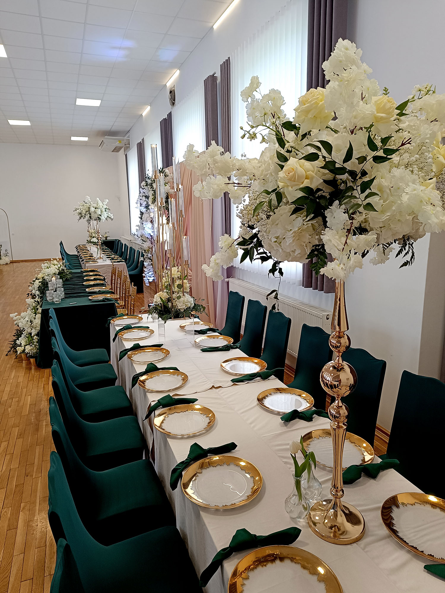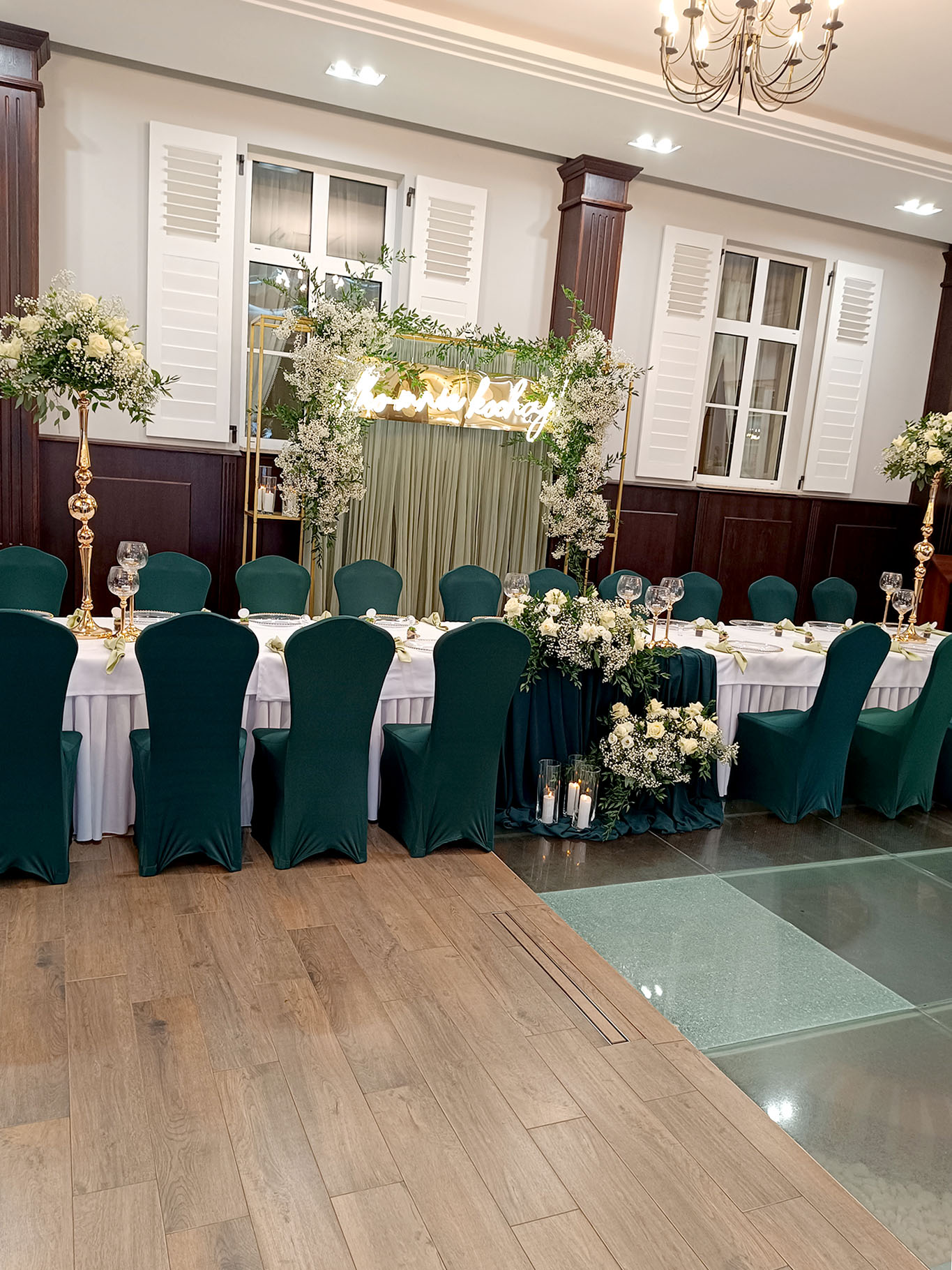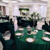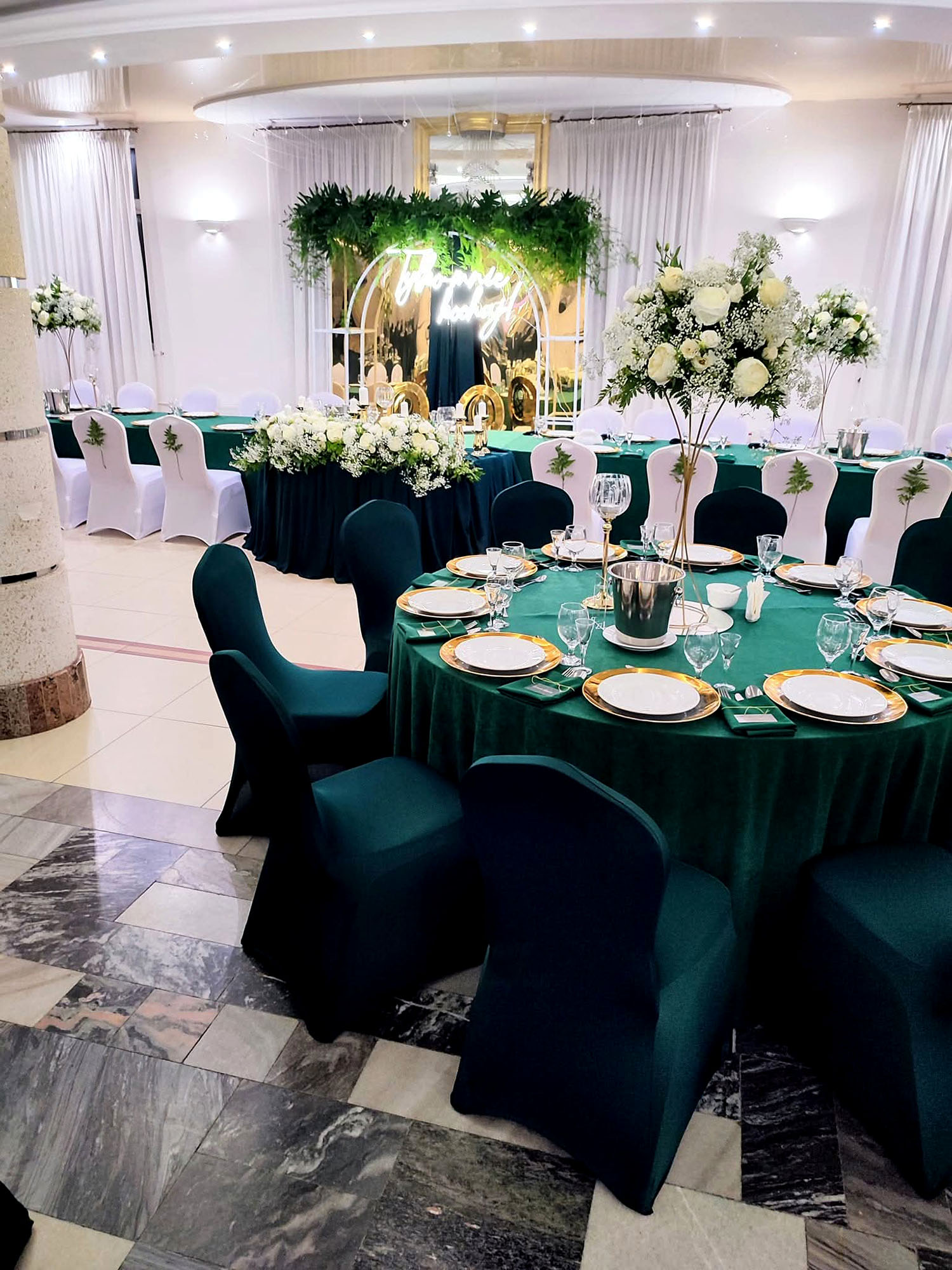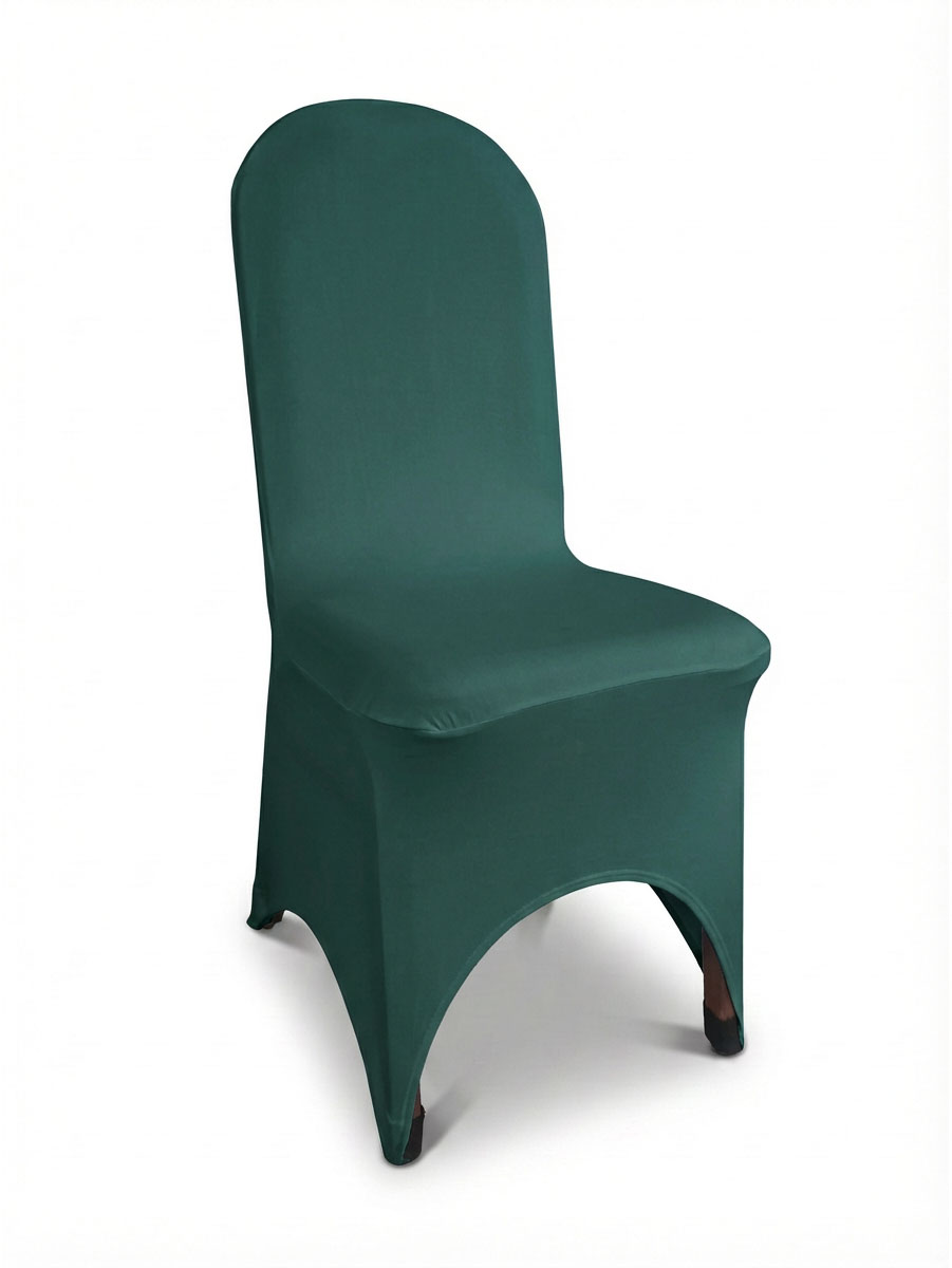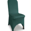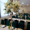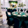 Pokrowiec w odcieniu butelkowej zieleni to wybór, który wprowadza do sali szyk i nowoczesność. Dzięki elastycznemu materiałowi łatwo dopasowuje się do różnych krzeseł. Kolor działa elegancko i wyraziście, pięknie komponując się ze złotem oraz naturalnymi dekoracjami roślinnymi.