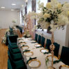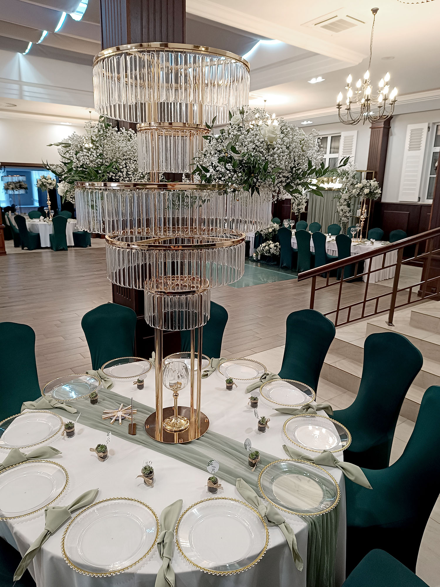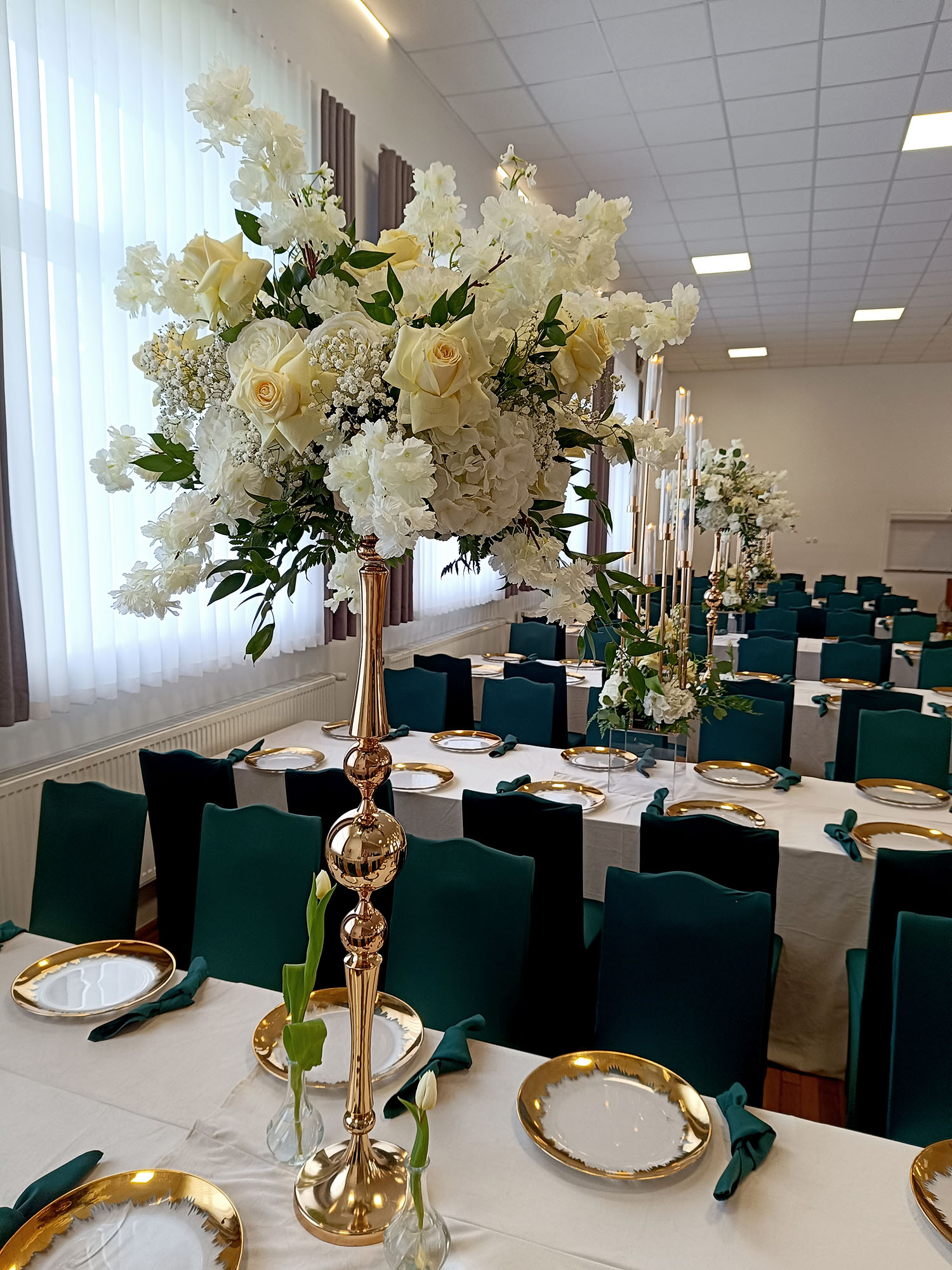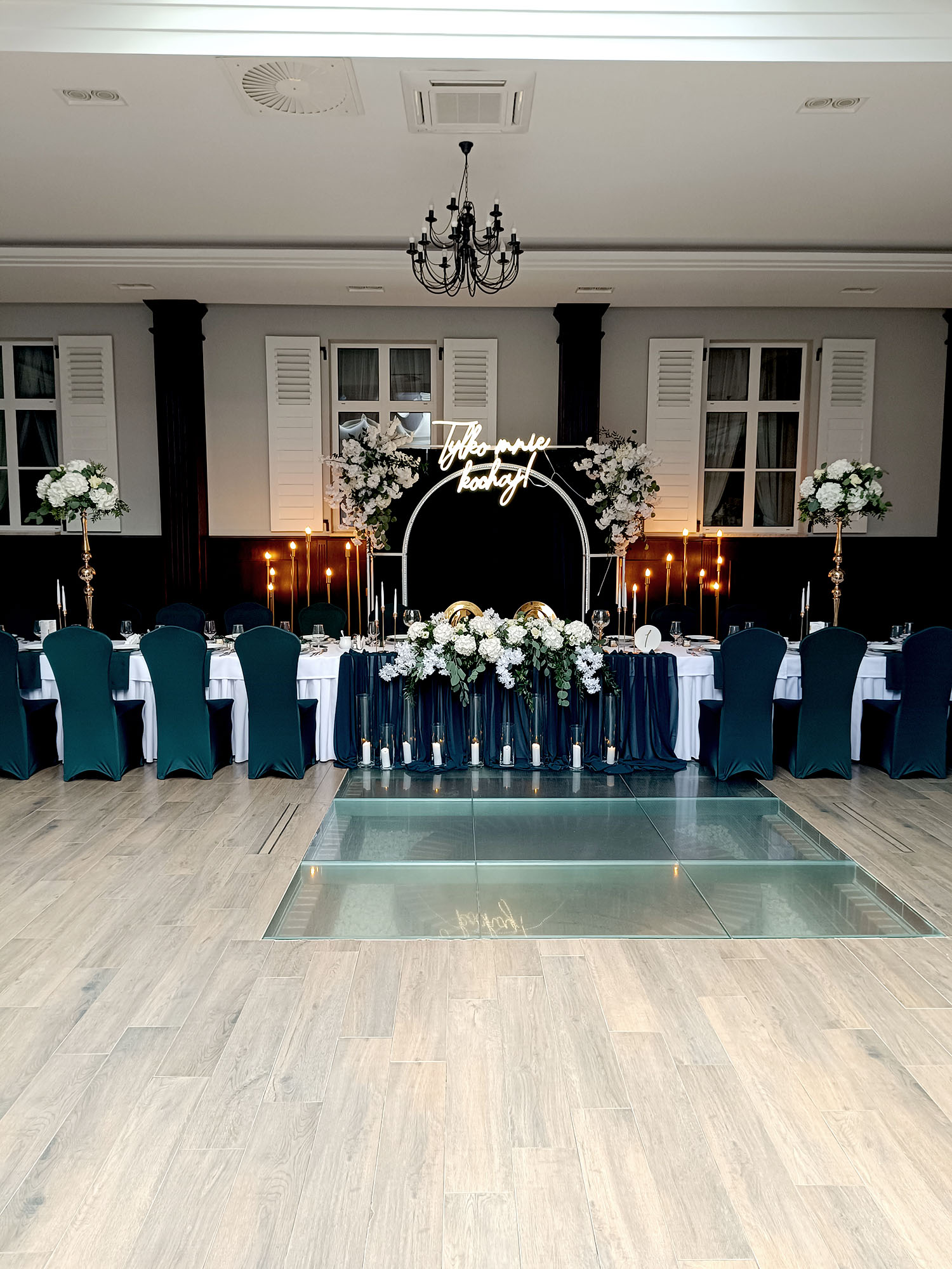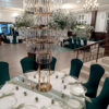 Pokrowiec w odcieniu butelkowej zieleni to wybór, który wprowadza do sali szyk i nowoczesność. Dzięki elastycznemu materiałowi łatwo dopasowuje się do różnych krzeseł. Kolor działa elegancko i wyraziście, pięknie komponując się ze złotem oraz naturalnymi dekoracjami roślinnymi.