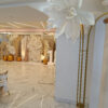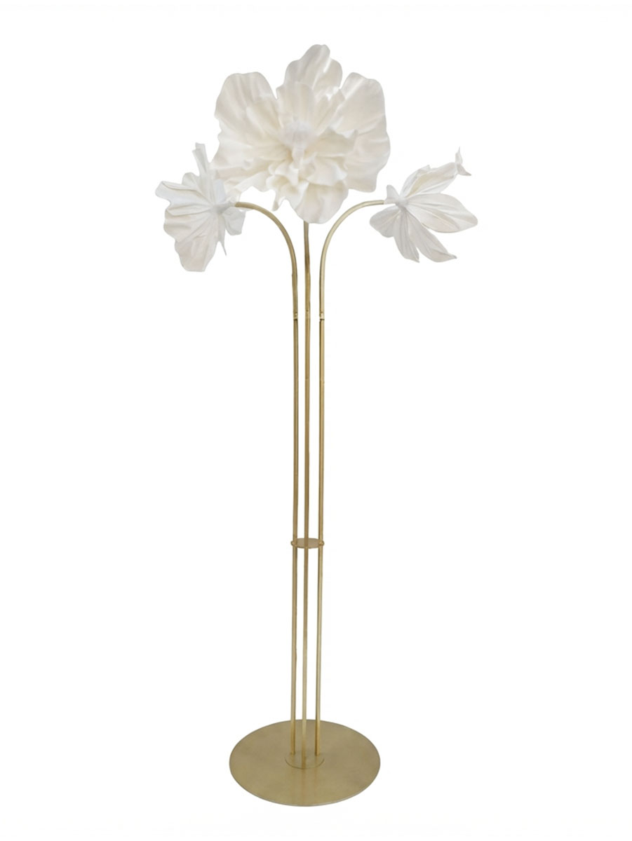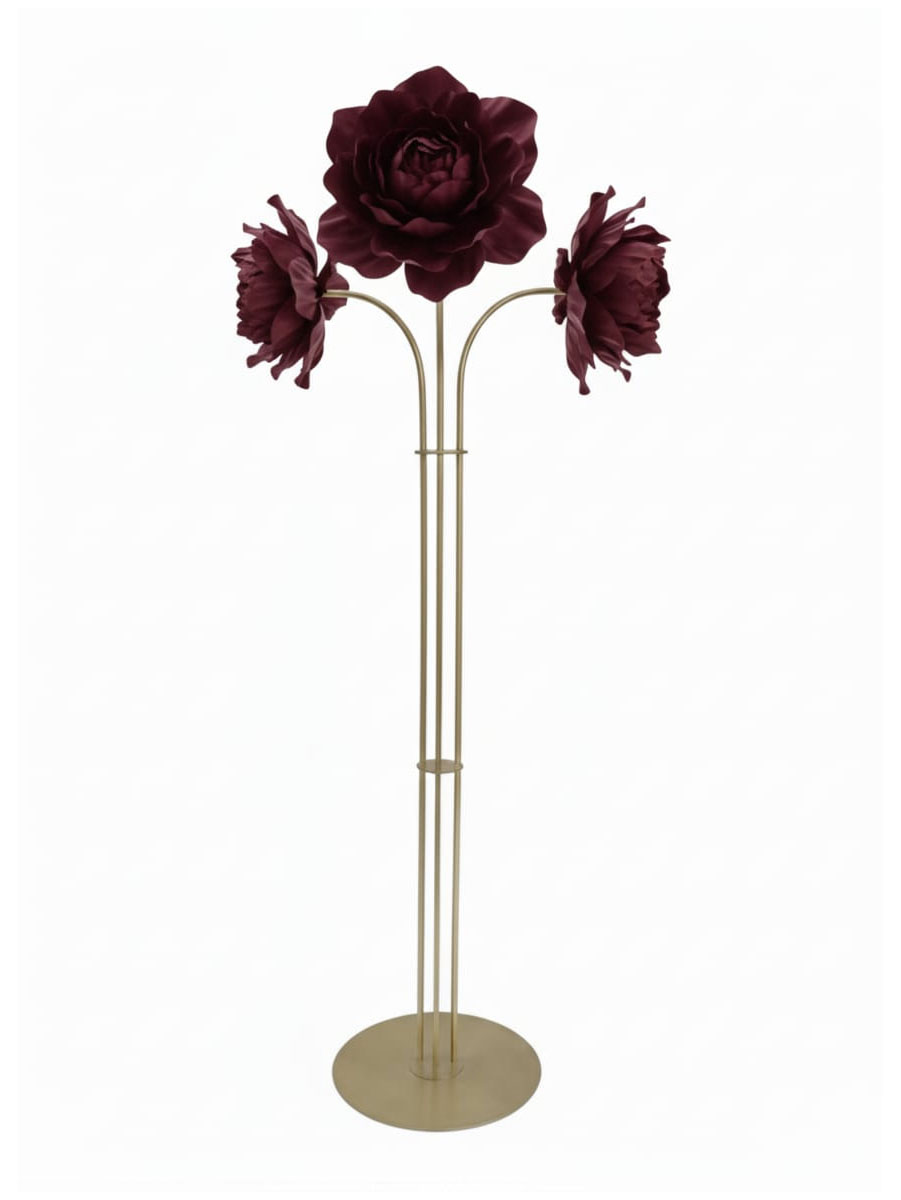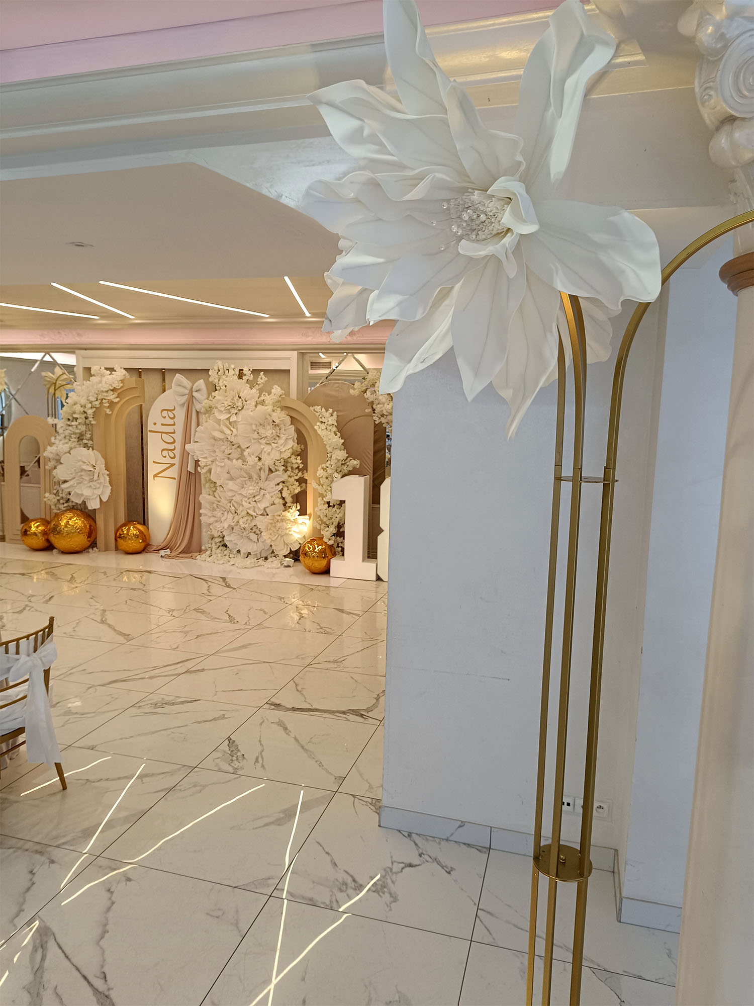 Rozkładany stelaż metalowy w kolorze złota z trzema ramionami i kwiatami gigantami stanowi wyjątkowy element dekoracyjny. Idealny jako tło ceremonii lub dekoracja sali.