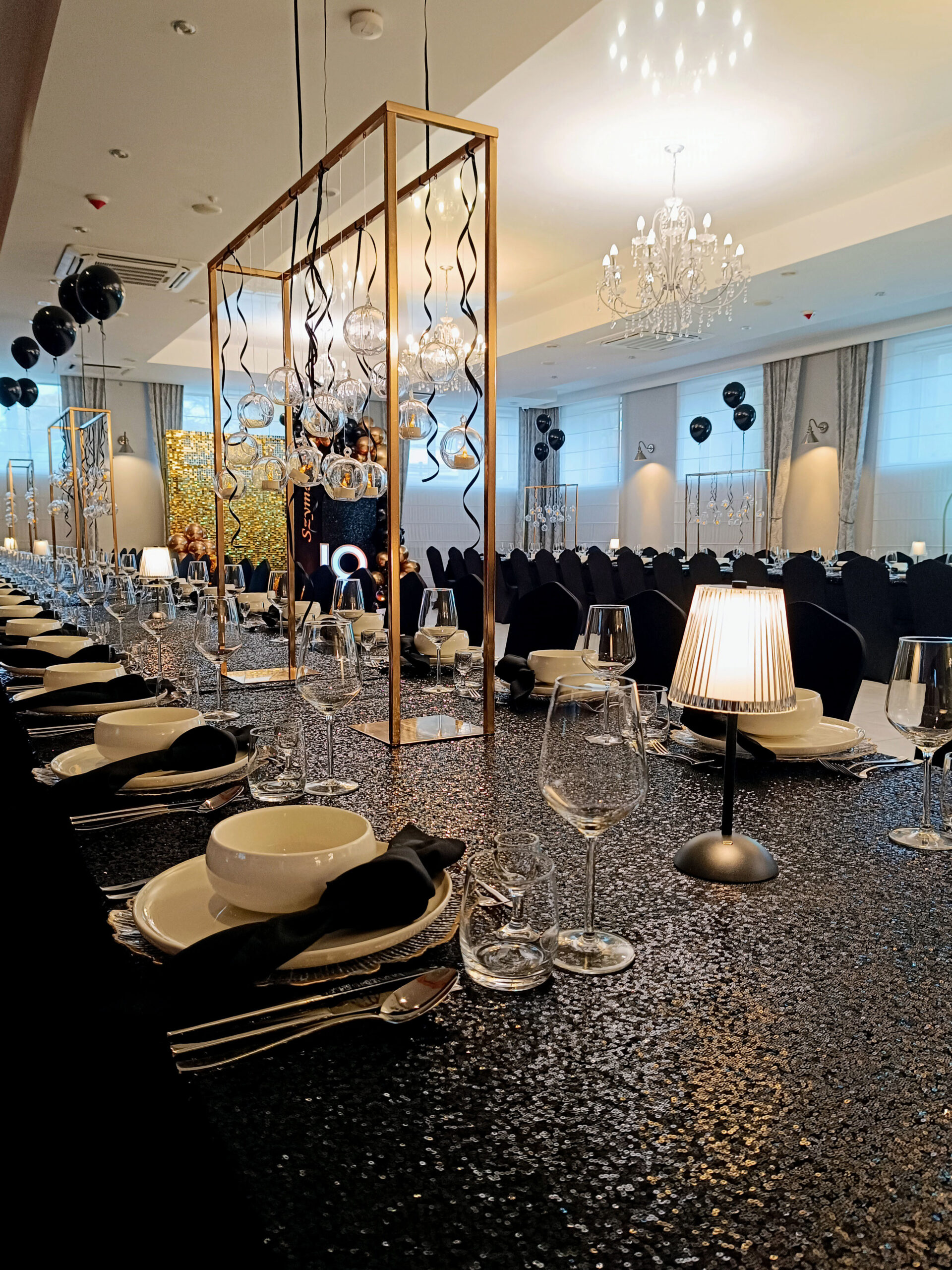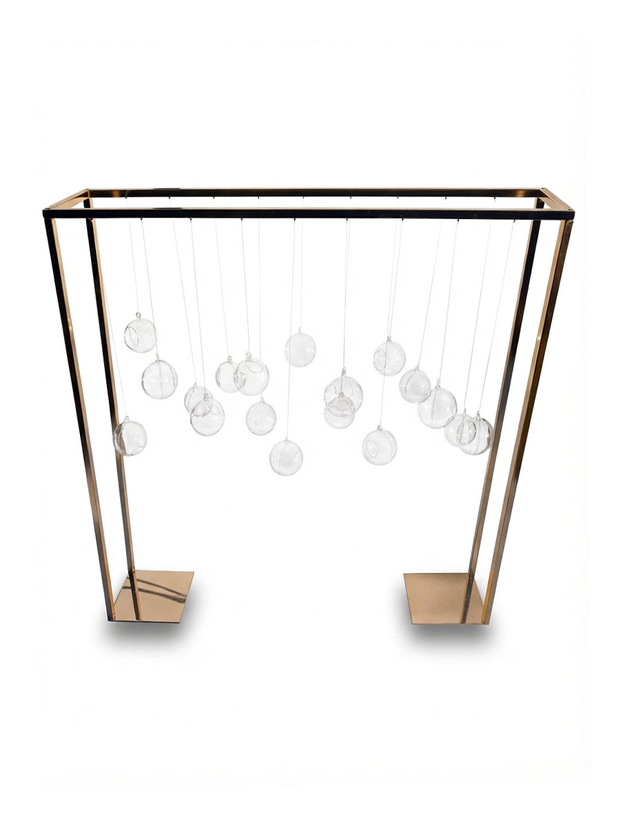 Stojak „Bańki” to dekoracja, która robi wrażenie od pierwszego spojrzenia. Dzięki plastikowym kulom tworzy efekt przestrzennej instalacji. Złoty stelaż pięknie komponuje się z florystyką oraz światłem — idealny do strefy zdjęciowej, przy wejściu, przy słodkim stole lub jako fragment ścianki ślubnej.