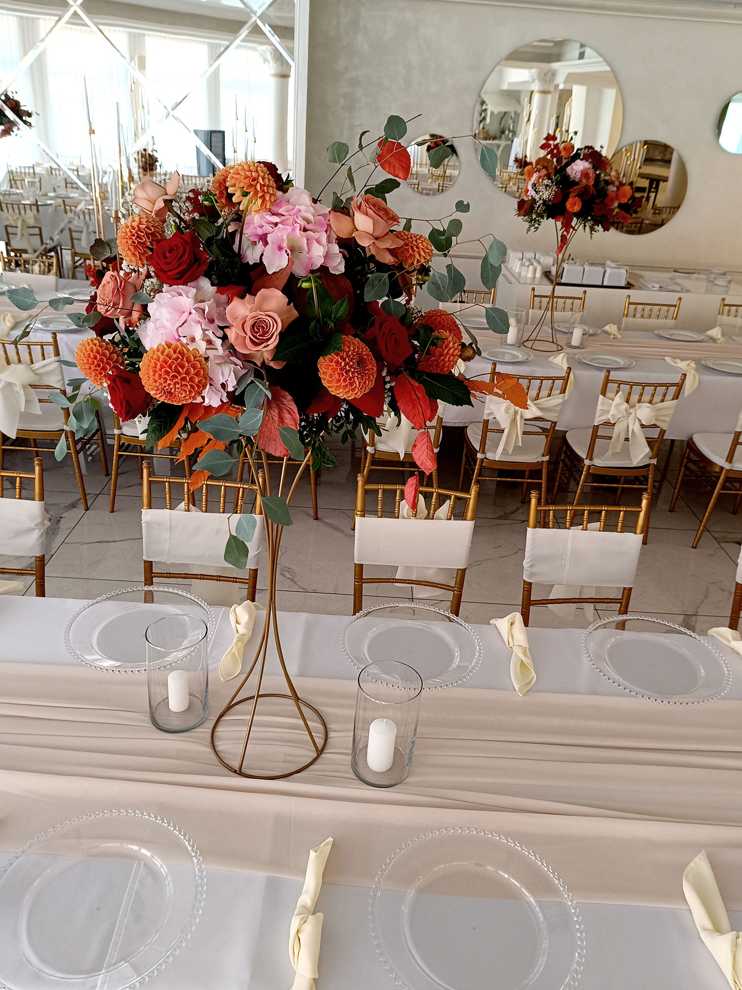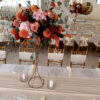 Stojak „Klepsydra” to propozycja dla osób, które szukają efektownej, a zarazem lekkiej wizualnie podstawy pod kompozycje kwiatowe. Jego zwężana forma sprawia, że bukiety stają się centralnym punktem dekoracji, a sam stojak wnosi nutę elegancji. Matowe złoto doskonale wpisuje się w aktualne trendy dekoracyjne, pasując zarówno do sal bankietowych, jak i aranżacji plenerowych.